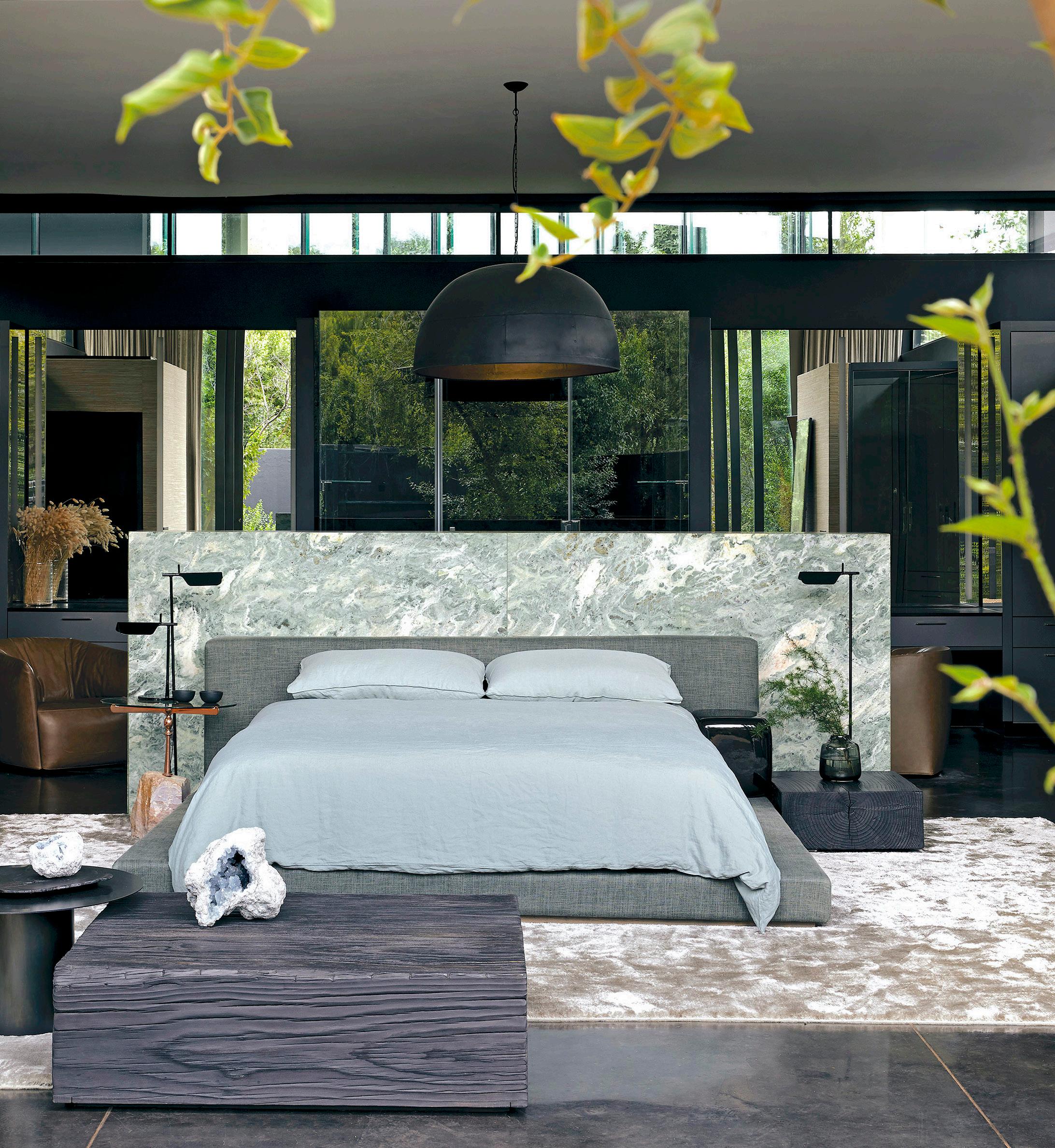A dramatic 38-m glass-lined passage ends in a custom-designed pivot door, skylights let in light in below a canopy of ancient Combretums, and once up on the roof garden, where indigenous planting offers shade and greenery for the glass bathroom roofs, it’s possible to understand the depth of vision for this ambitious project.