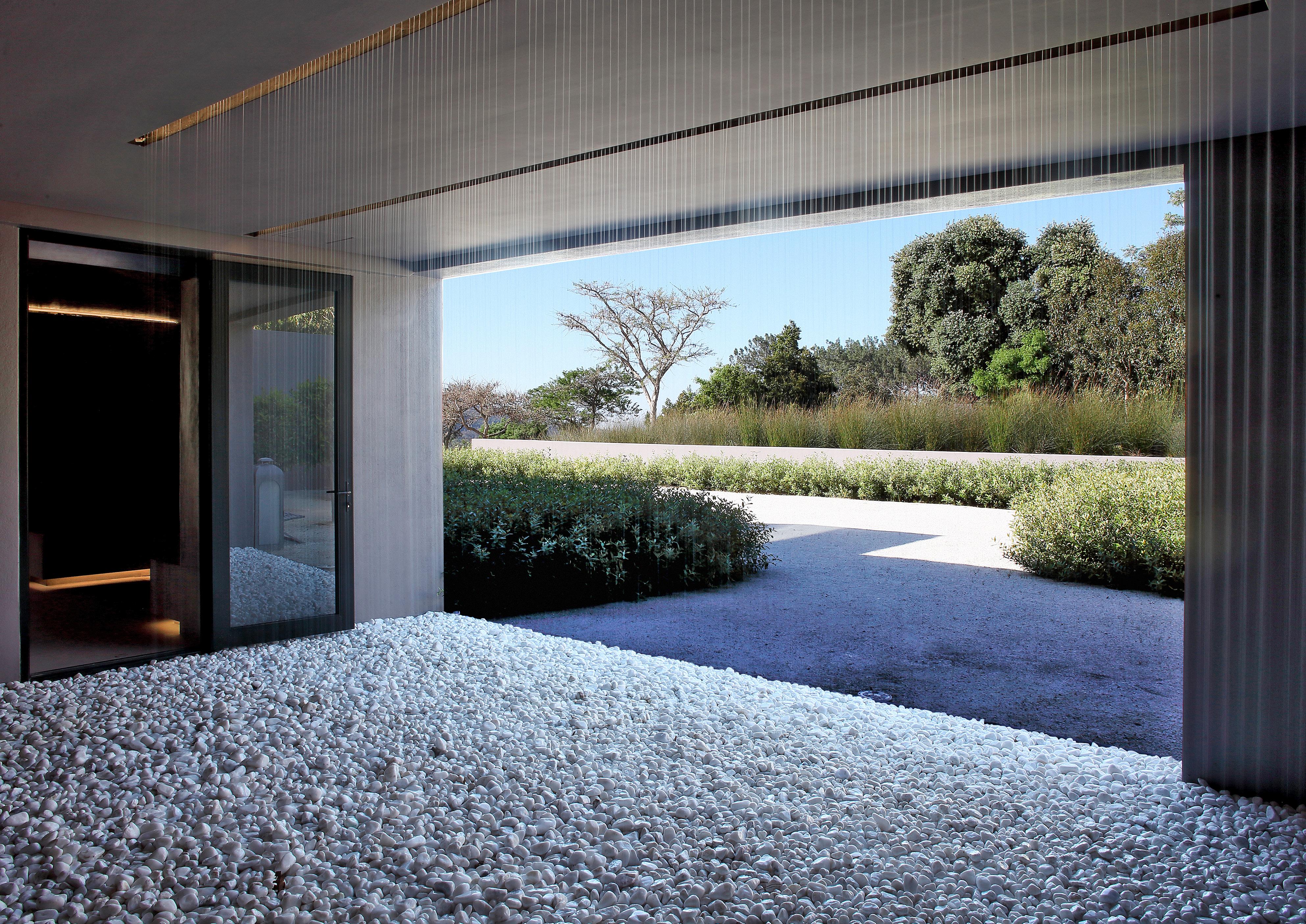 Set on 2.5 acres of acacia trees and restionaceae grasses, Villa Intaba is a monolithic statement of linear perfection. Old Ficus trees, trickling water features and meticulously tiered hedges, with the lush greenery cascading the back of Table Mountain command your attention . Inspired by the “haiku” effect of Japanese architect Tadao Ando’s style of spatial circulation, light bounces off every symmetrical surface of the Indian Dholpur sandstone that dominates throughout. A relentless reflection of nature in all its glory.