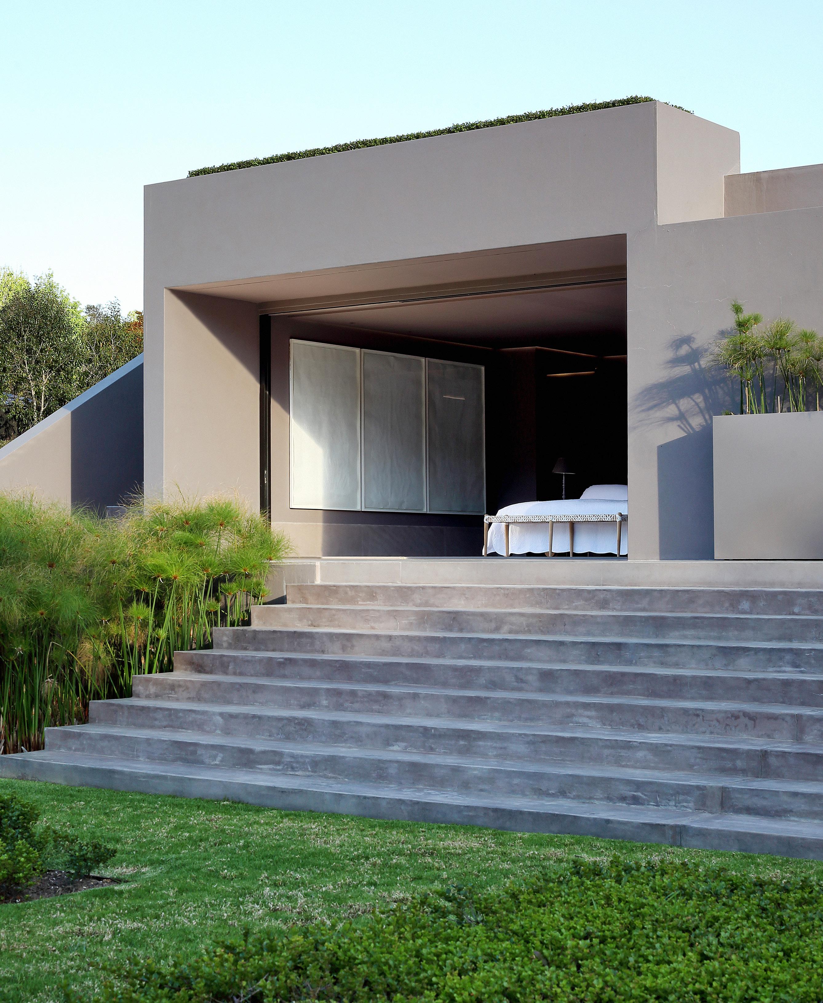 Set on 2.5 acres of acacia trees and restionaceae grasses, Villa Intaba is a monolithic statement of linear perfection. Old Ficus trees, trickling water features and meticulously tiered hedges, with the lush greenery cascading the back of Table Mountain command your attention . Inspired by the “haiku” effect of Japanese architect Tadao Ando’s style of spatial circulation, light bounces off every symmetrical surface of the Indian Dholpur sandstone that dominates throughout. A relentless reflection of nature in all its glory.
