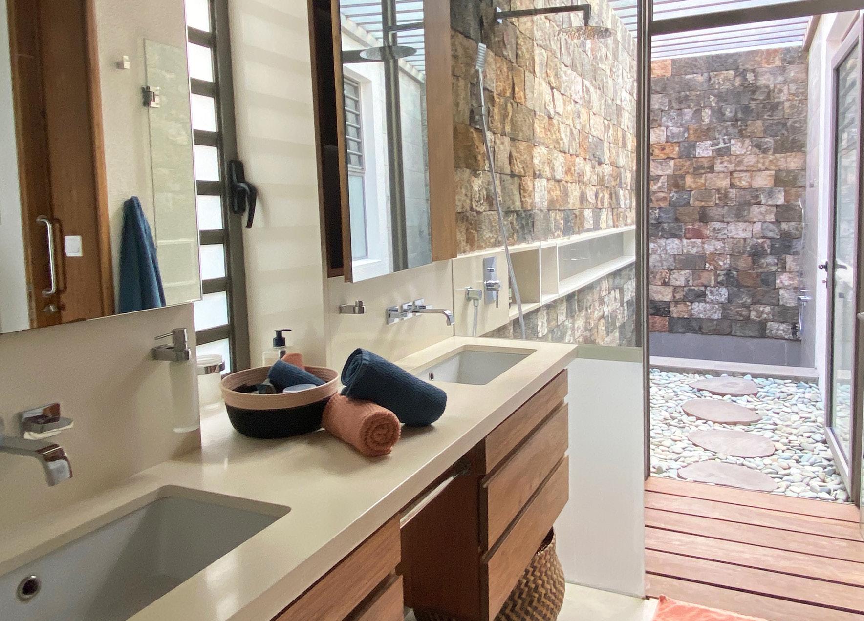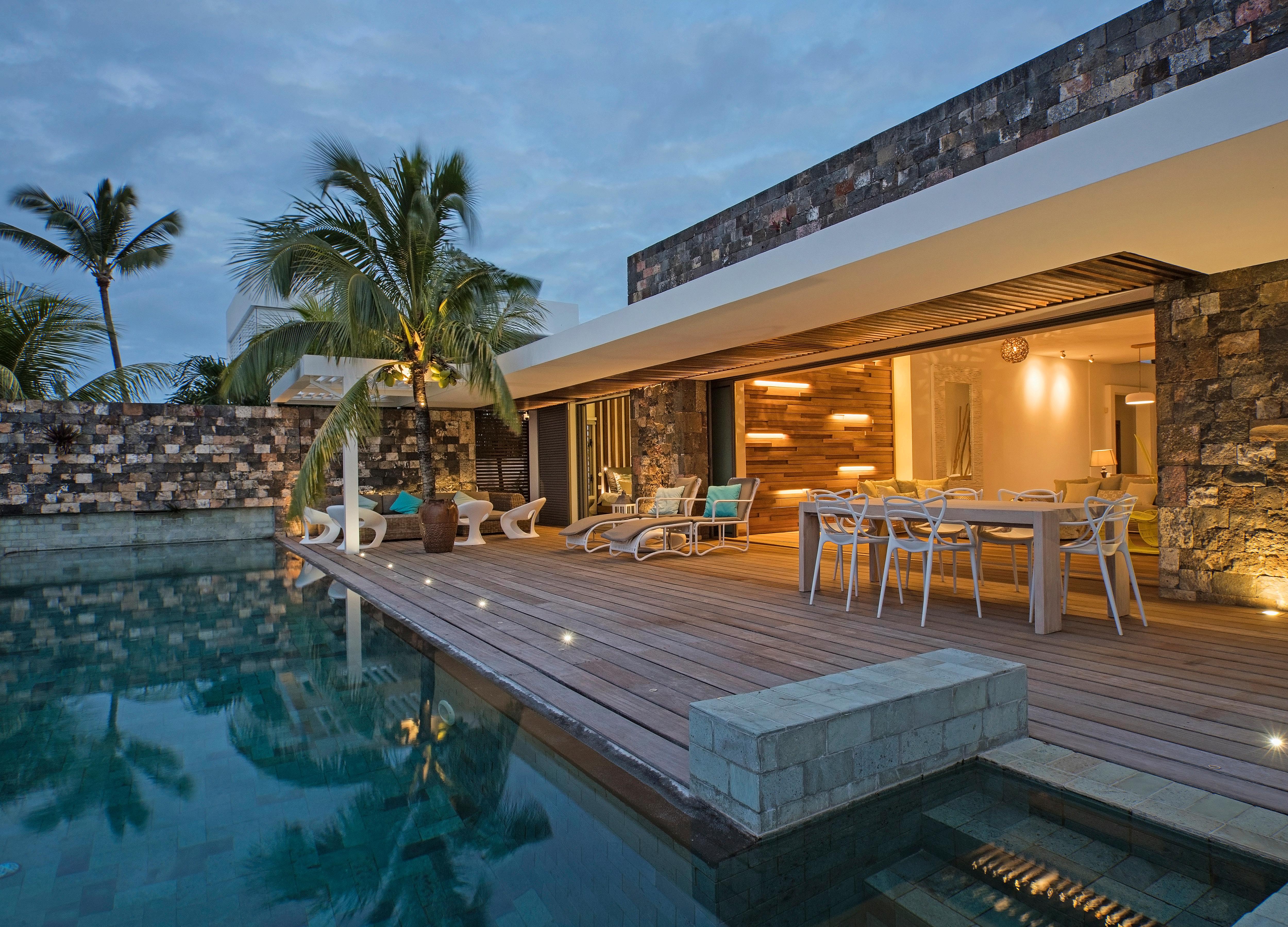 Occupying a secluded stretch of sand, directly on the beach of Cap Malheureux, this hideaway – with its avant-garde attire and ample entertaining spaces – invokes a giddy holiday temperament that’s eager to surface. The property is set on one vast level of living, dining, entertaining and reclining spaces, long verandahs that meet a dreamy swimming pool, blending in with the tones of the water below. A tropical garden of bougainvillea hedges and palms, a built-in beach with sun loungers, and languid outdoor seating scattered beneath the trees. Five beautiful bedrooms –three of which are ensuite – flank the living areas, with a separate ensuite that has its own little terrace upstairs. A TV/family room and two kitchens – a scullery space and long cooking area –seclude themselves from the main living rooms, allowing for all of the entertaining to take place around the living areas, whilst the chefs work their magic behind the scenes.