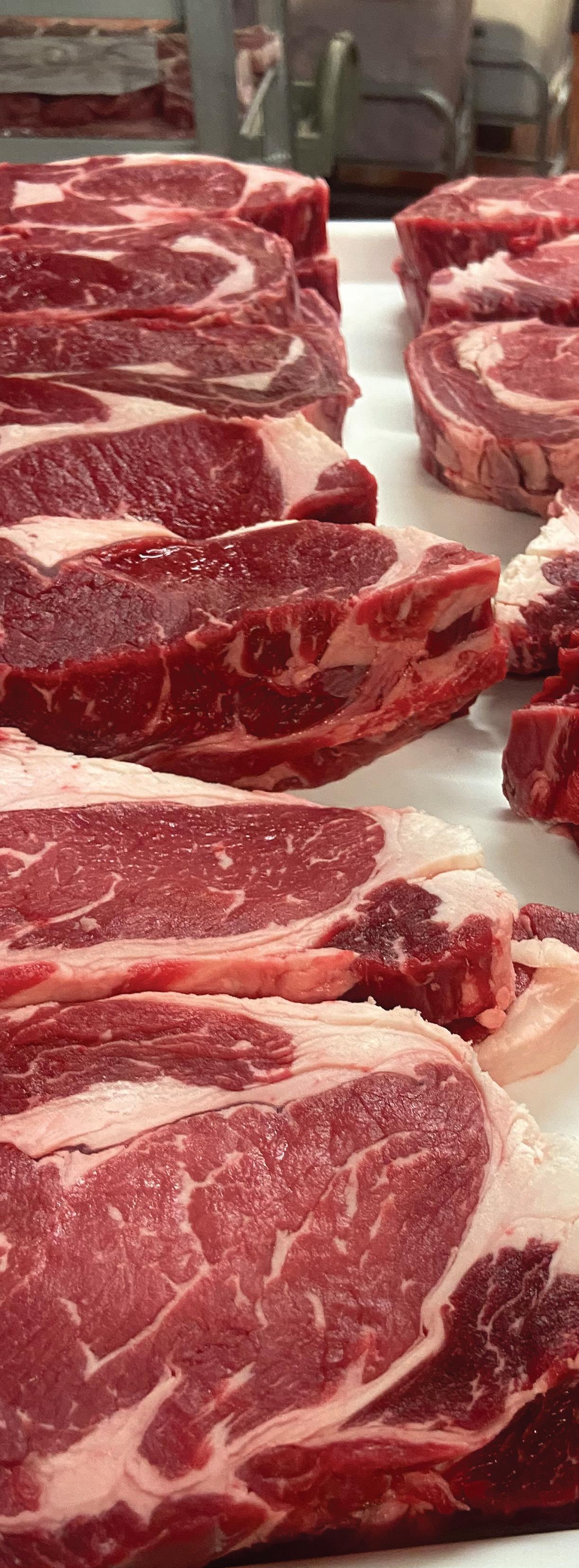 After the aging process is complete, every strip, rib and tenderloin is weighed and racked according to eye-size prior to production. This ensures the end product will be consistent in size and shape as the product is hand-cut by professional butchers.