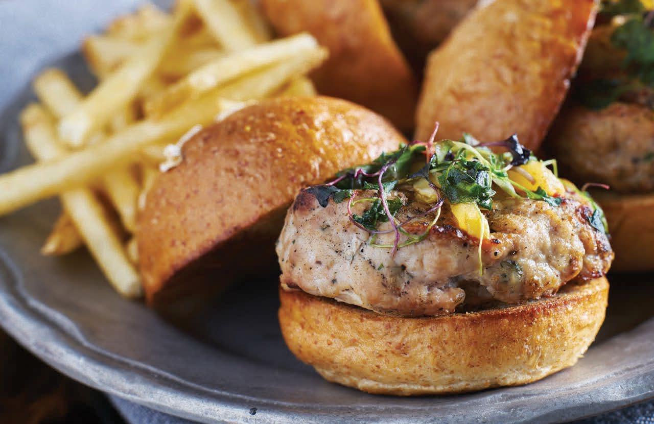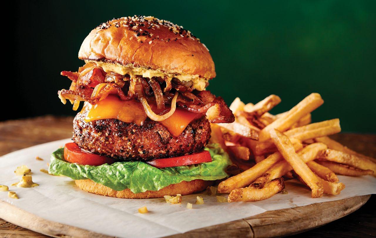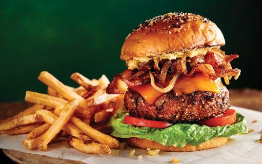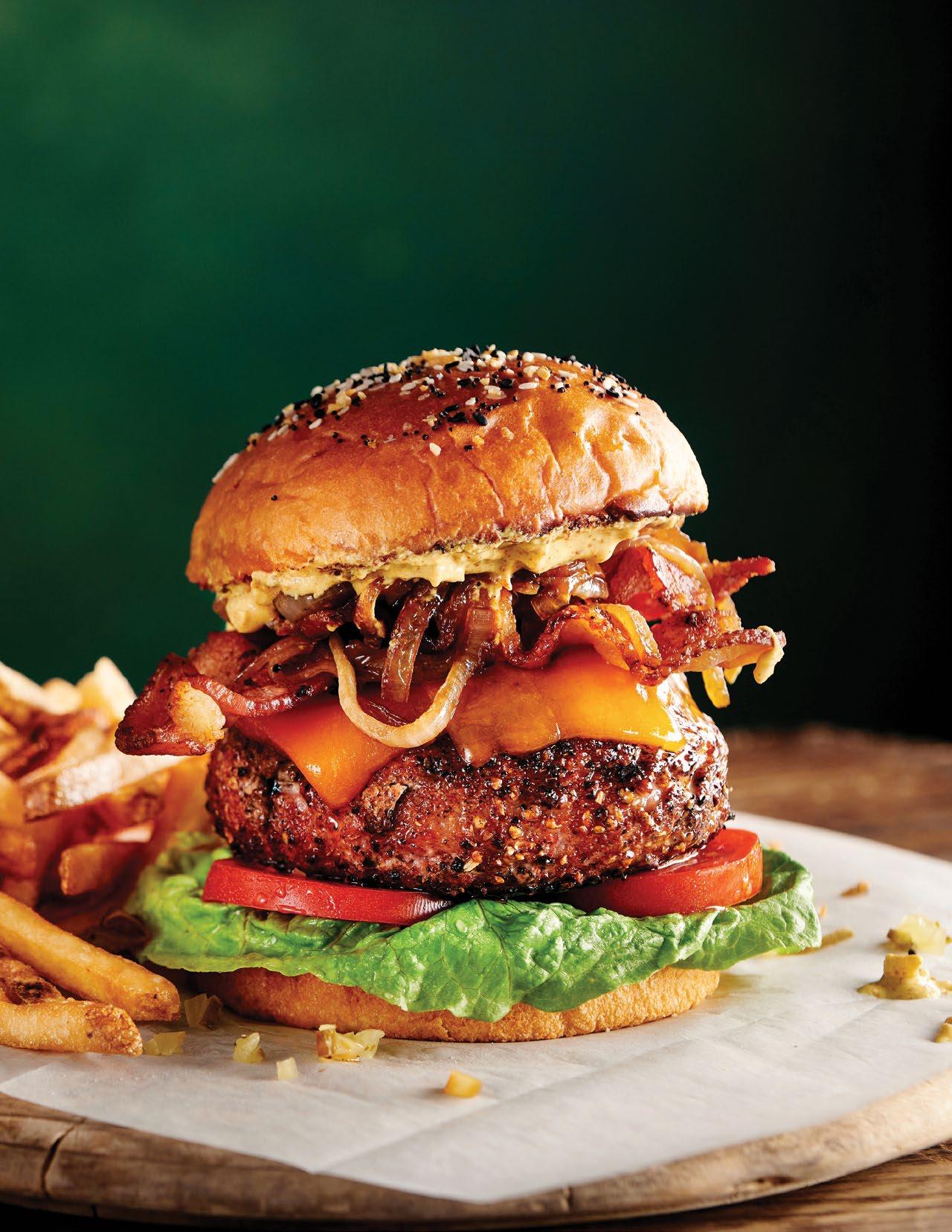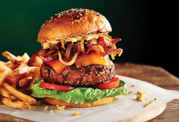 A brown sugar-infused Pastrami seasoned turkey burger kiaded wuth bacon, cheese, and stout beer-sautee’d onions.