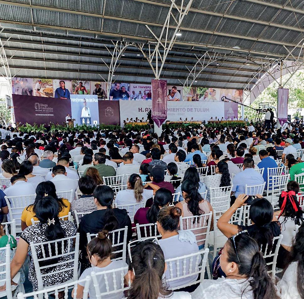 Por Redacción › Quequi En sesión solemne de Cabildo y con la presencia de los titulares de los Poderes Ejecutivo, gobernadora Mara Lezama Espinosa; Legislativo, diputado Renán Sánchez Tajonar y Judicial, magistrado Heyden Cebada Rivas, el presidente municipal de Tulum, Diego Castañón Trejo, rindió el Primer Informe de Gobierno de la administración 2024-2027. En el domo doble de la unidad deportiva, el presidente Diego Castañón entregó a la gobernadora Mara Lezama, a los representantes de los Poderes y a los regidores, el libro que contiene el informe del estado que guarda la administración municipal, para luego darle un mensaje al pueblo de Tulum. Diego Castañón destacó que los logros obtenidos este año para el bienestar de la ciudadanía tienen el respaldo de la gobernadora Mara Lezama, quien con el gobierno de la Cuarta Transformación regresó la visibilidad y orgullo al pueblo maya con la grandeza del turismo comunitario, los bordados, las manos artesanas y las cocineras tradicionales.