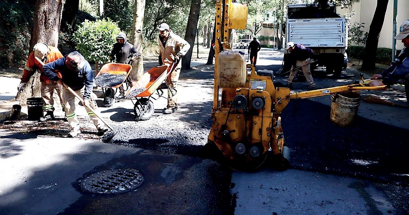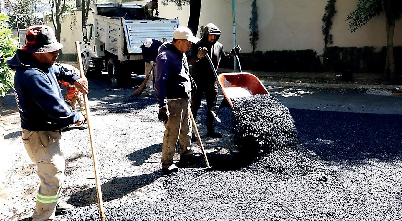 la superficie dañada para facilitar el flujo vehicular. › El personal de servicios urbanos aplicó la mezcla asfáltica en las calles de Ahuehuetes.