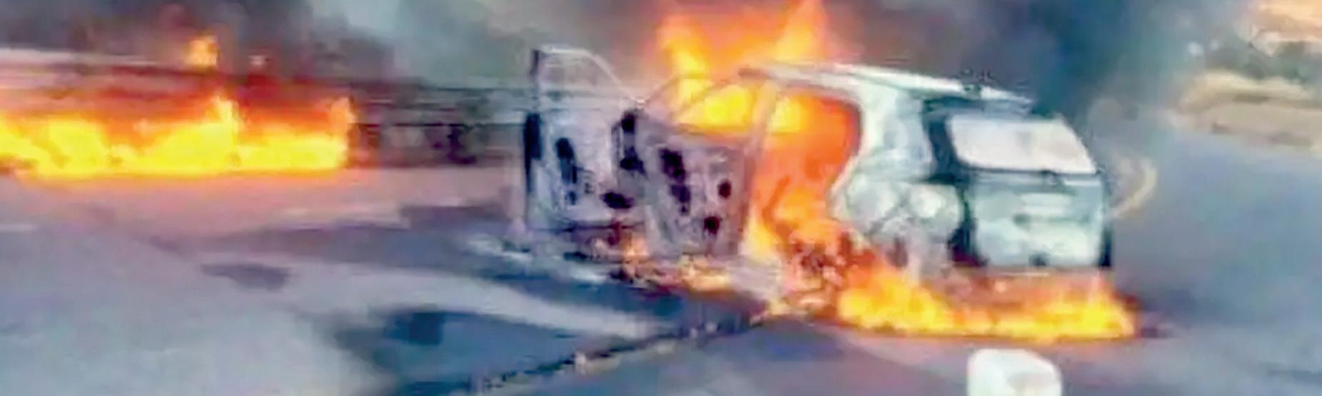› TRAS EL ENFRENTAMIENTO, EN EL LUGAR QUEDÓ UNA PATRULLA CON VARIOS IMPACTOS DE BALA EN DIFERENTES PARTES DE LA CARROCERÍA; OTRA PATRULLA Y UN VEHÍCULO, AL PARECER DONDE VIAJABAN LOS AGRESORES, TERMINARON TOTALMENTE ENVUELTOS EN LLAMAS.