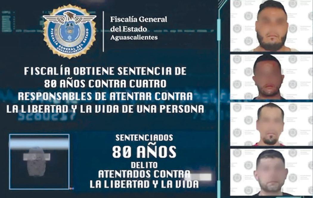 Sentencia. Aldo Giovanni, Juan Manuel, Michael y Samuel fueron sentenciados a 80 años de cárcel por secuestrar a una persona en el fraccionamiento La Ribera, a quien le quitaron la vida en Aguascalientes.