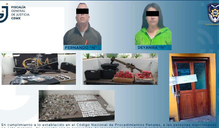 de la FGJ-CDMX, con apoyo de la Secretaría de la Defensa Nacional (Sedena) y la Guardia Nacional (GN), inspeccionó un domicilio ubicado en la colonia Pensador Mexicano, alcaldía Venustiano Carranza, donde detuvo a Jesús Arturo “N” y aseguró aproximadamente 72 dosis de vegetal verde, 10 bolsitas con posible cocaína y 11 bolsas con probable metanfetamina. Ese mismo día, agentes de investigación detuvieron a Fernando Gabriel “N” y Deyanira “N” en un inmueble localizado en la colonia Minas Cristo Rey, alcaldía Álvaro Obregón, luego de asegurar aproximadamente 138 bolsas con posi-