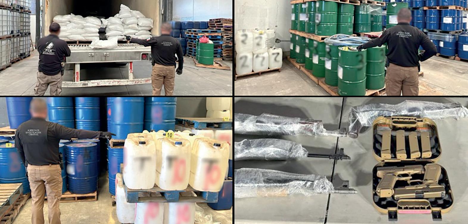 un cateo en la colonia Barrancos, en Culiacán, Sinaloa, donde aseguraron alrededor de 120 mil litros de sustancias con las características de la acetona, tolueno, sosa cáustica, ácido clorhídrico, ácido sulfúrico, etanol, acetato de plomo, alcohol bencílico, entre otras. Además de un tractocamión, un remolque, un montacarga y objetos del delito.