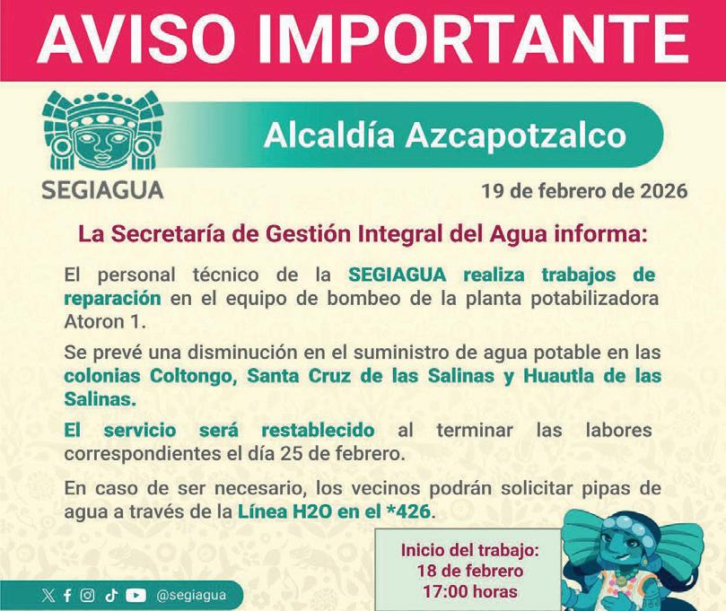 El próximo 19 de febrero, la alcaldía Azcapotzalco enfrentará una reducción en el suministro de agua potable debido a trabajos de reparación en el equipo de bombeo de la planta potabilizadora Atoron 1. Las autoridades han señalado que estas labores son necesarias para garantizar el buen funcionamiento del sistema y la calidad del servicio en la zona.