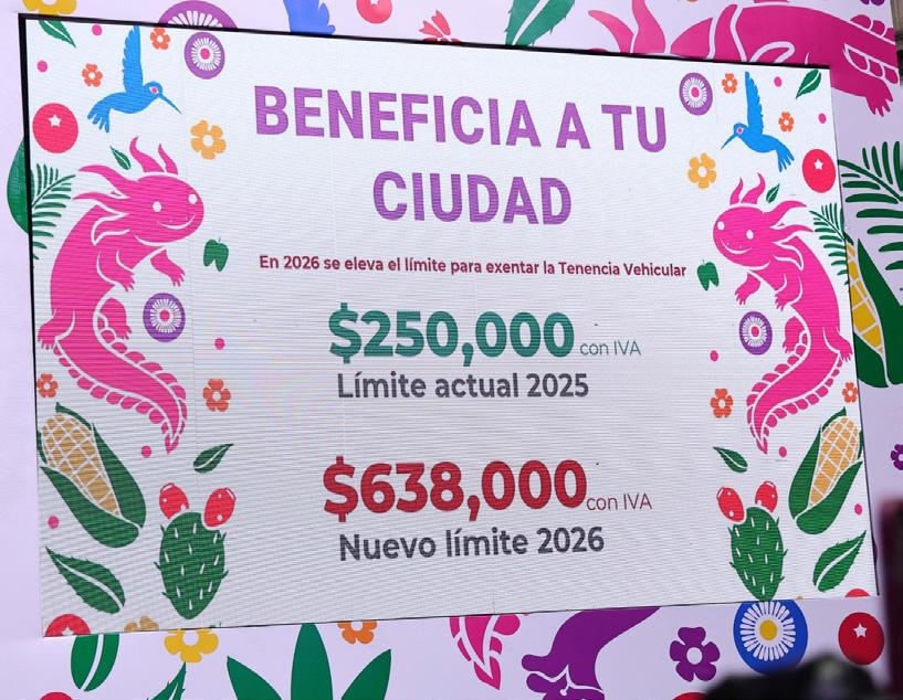 Destacó que el subsidio a la tenencia vehicular de este año 2026 implica grandes ahorros para los dueños de autos con un valor de hasta 638 mil pesos, pues “un coche cuyo costo es de 300 mil pesos pagaba el año pasado 7 mil 750 pesos de tenencia; hoy sólo va a pagar 760 pesos de refrendo, que es otro trámite”.
