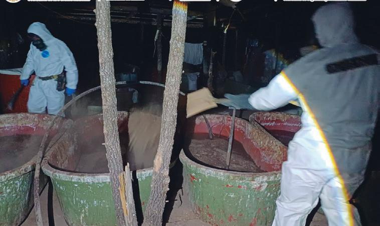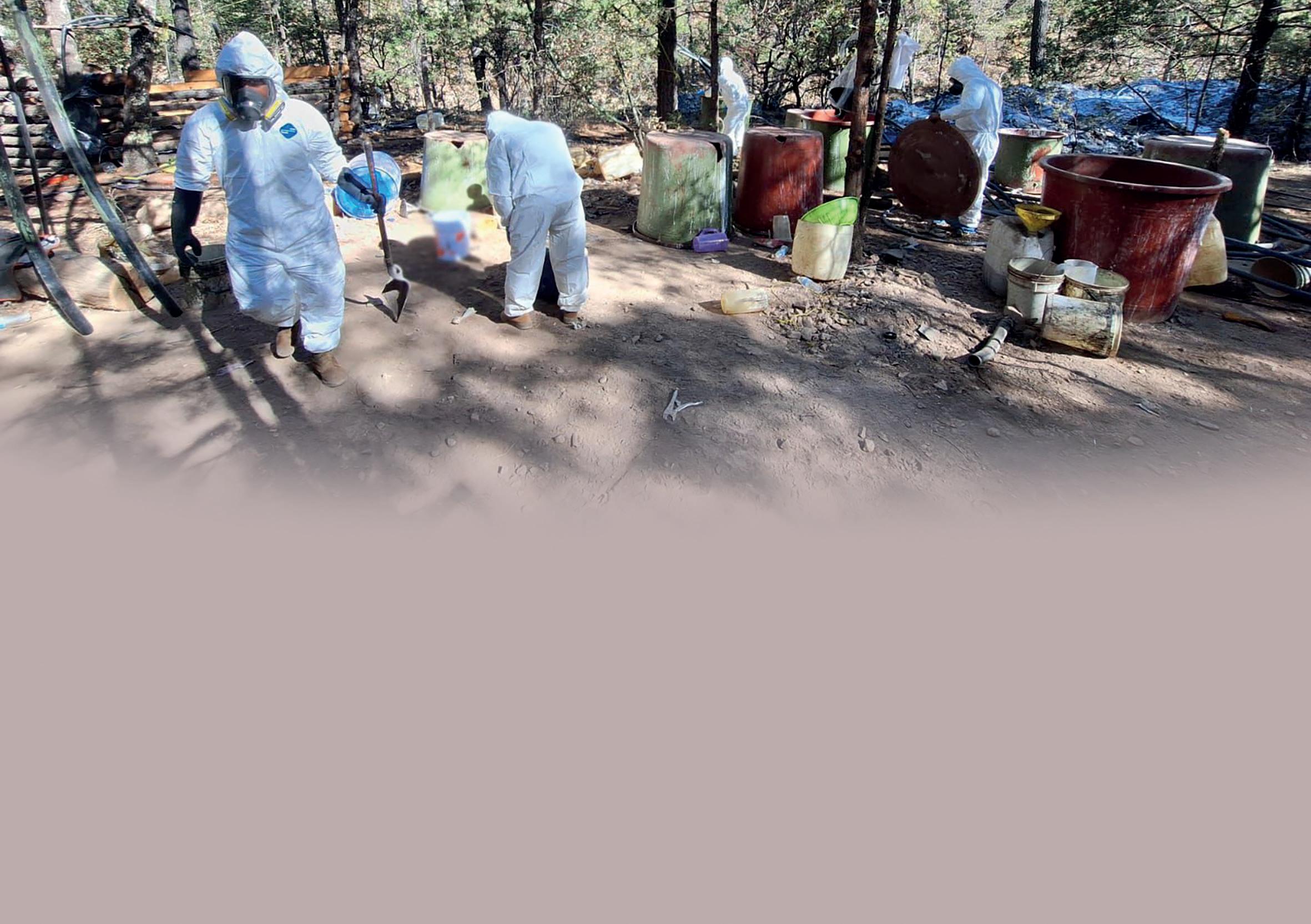EN EL ÁREA DE ALMACENAMIENTO de pre-precursores fueron asegurados aproximadamente 63,100 litros de diferentes sustancias, entre las que destaca el cloruro de bencilo, así como 125 kilogramos de sosa cáustica. EN ESTE COMPLEJO, CON EXTENSIÓN DE 395 MIL METROS CUADRADOS, SE ASEGURARON 36 REACTORES, 56 TAMBOS, 65 TINAS, NUEVE MEZCLADORAS, 77 TANQUES DE GAS, 209 BIDONES, CUATRO MOTOGENERADORES, 62 CONDENSADORES, 94 QUEMADORES Y MATERIAL DIVERSO. DATO