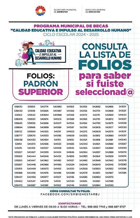 El Ayuntamiento de Benito Juárez, a través de la Secretaría Municipal de Bienestar y la Dirección General de Educación, anunció la lista de folios aprobados de los alumnos de Media Superior y Superior que serán beneficiados del programa municipal de becas “Calidad Educativa e Impulso al Desarrollo Humano” ciclo escolar 2024-2025.
