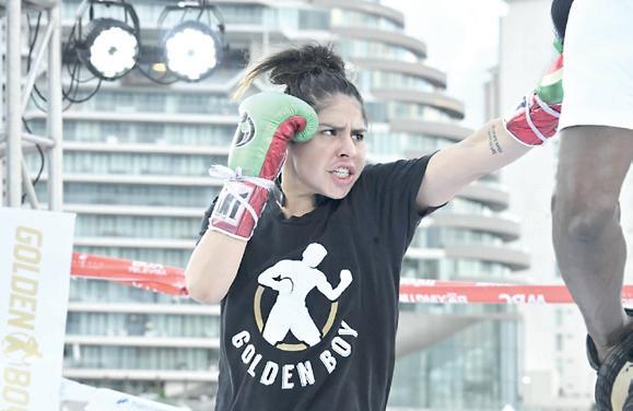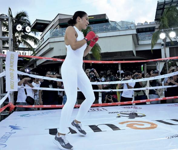 El entrenamiento público por parte de los pugilistas consistió en moverse un poco dentro del cuadrilátero, haciendo “sombra” y luego las manoplas con sus respectivos mánagers, siendo la primera en subir, la “tica” Yokasta Valle quien lució su belleza arriba del ring instalado exactamente en el muelle que da a la caleta con varios yates atracados y el edificio “Shark”.