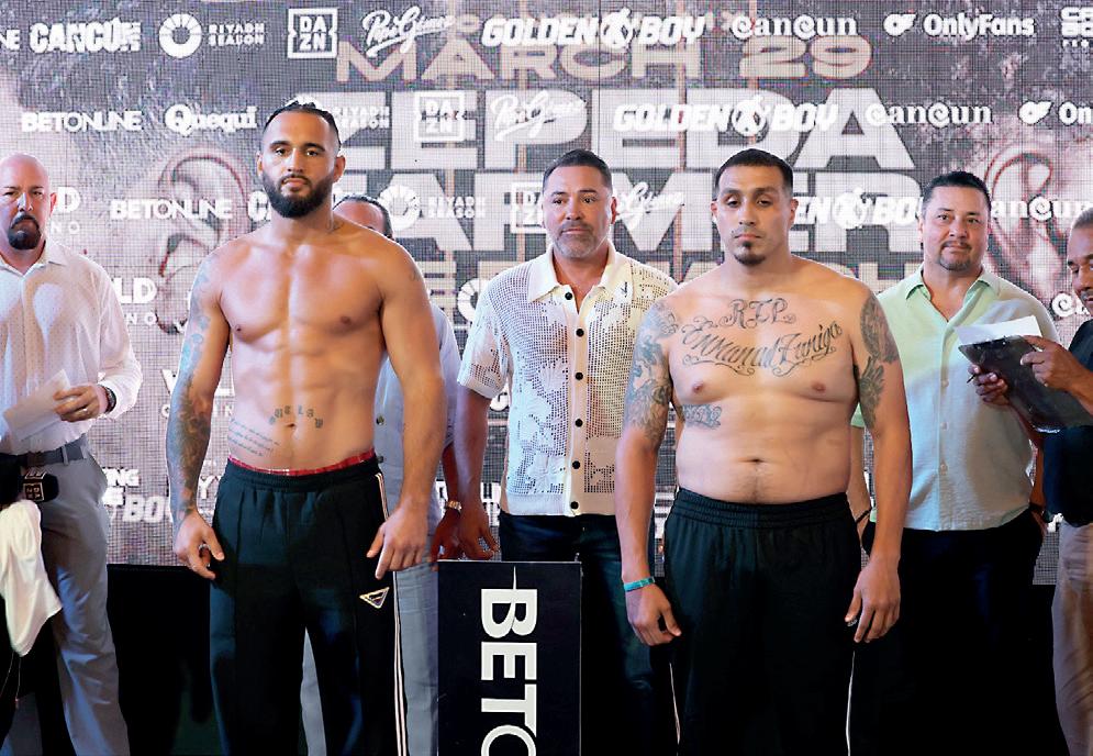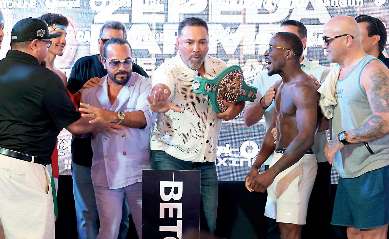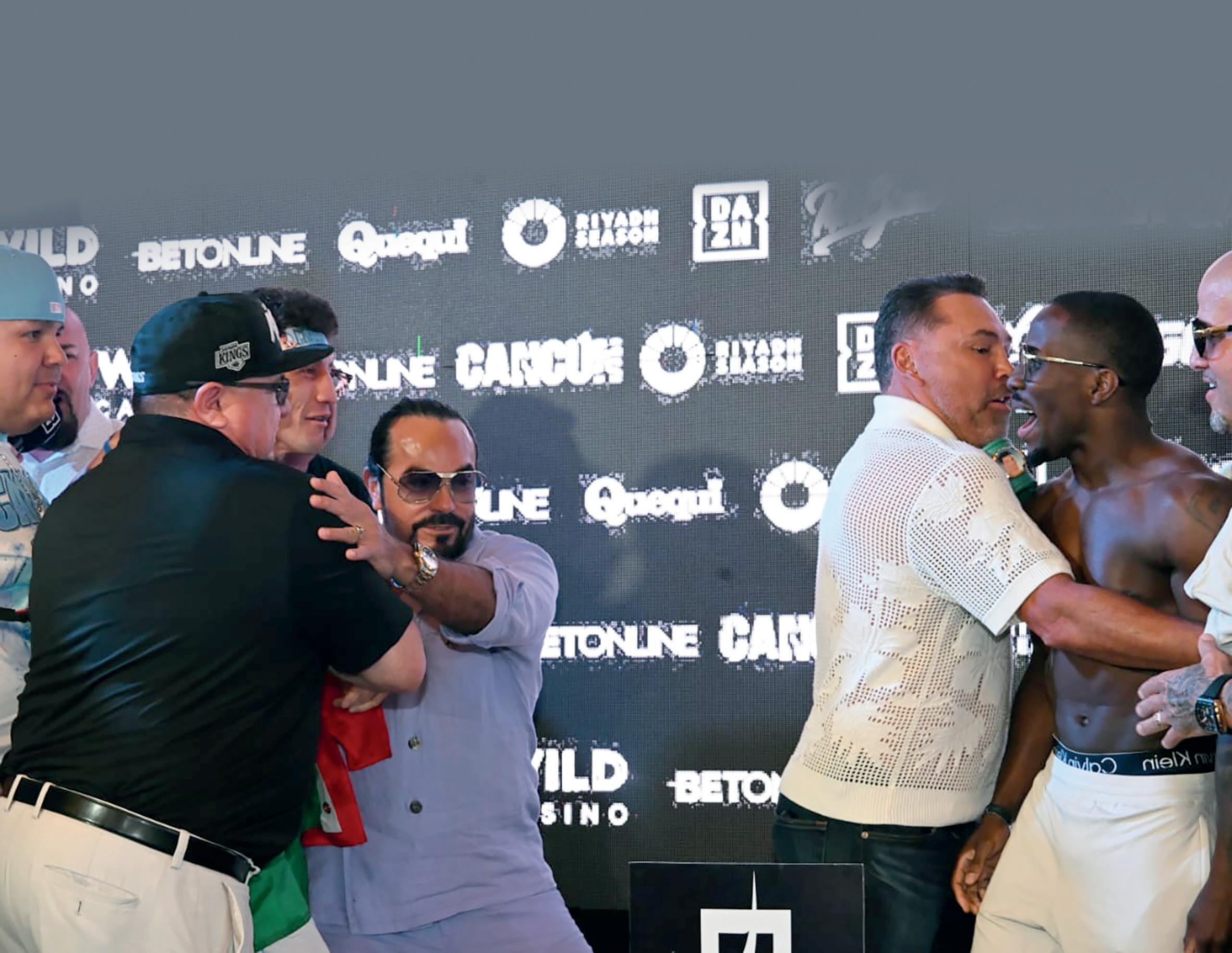 LOS PROMOTORES OSCAR DE LA HOYA Y PEPE GÓMEZ TUVIERON QUE INTERVENIR para separar al mexicano y el estadounidense, ante una serie de empujones e intercambio de palabras en el tenso cara a cara de la pelea estelar.