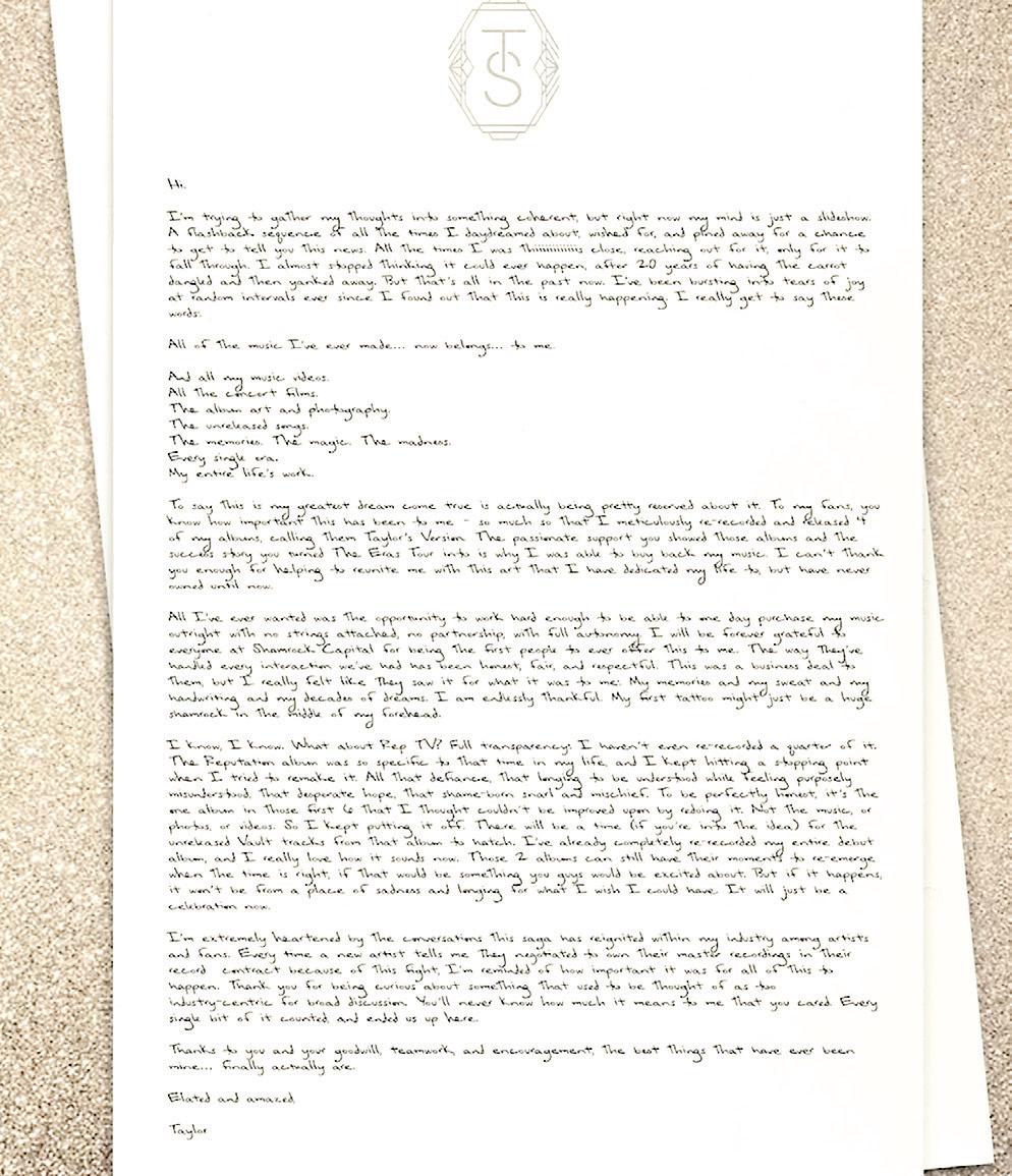 › A través de una carta escrita a mano en su sitio oficial, expresó su emoción y expuso todo lo que representa para ella recuperar el control de su música.