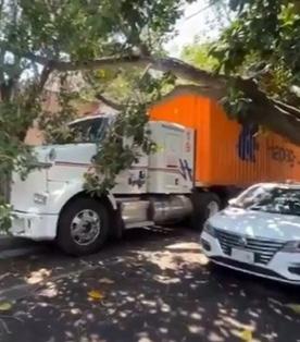 Un camión de carga derribó un árbol en calles de la colonia Narvarte; se reportaron afectaciones.