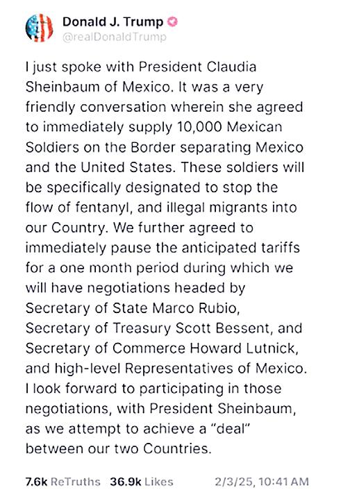 El 1 de febrero de 2025, el presidente de Estados Unidos, Donald Trump firmó las órdenes ejecutivas por las que entran en vigor a partir del martes los prometidos aranceles del 25% para los bienes de México y Canadá (con excepción del petróleo canadiense, que tendrá solo un 10%) y del 10% para los de China, sin embargo, en el caso de México se pausó un mes.