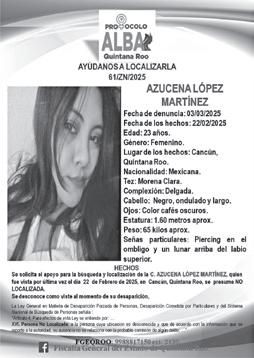 Activan ficha de búsqueda de Azucena López Martínez, vista por última vez el 22 de febrero de 2025, en Benito Juárez.
