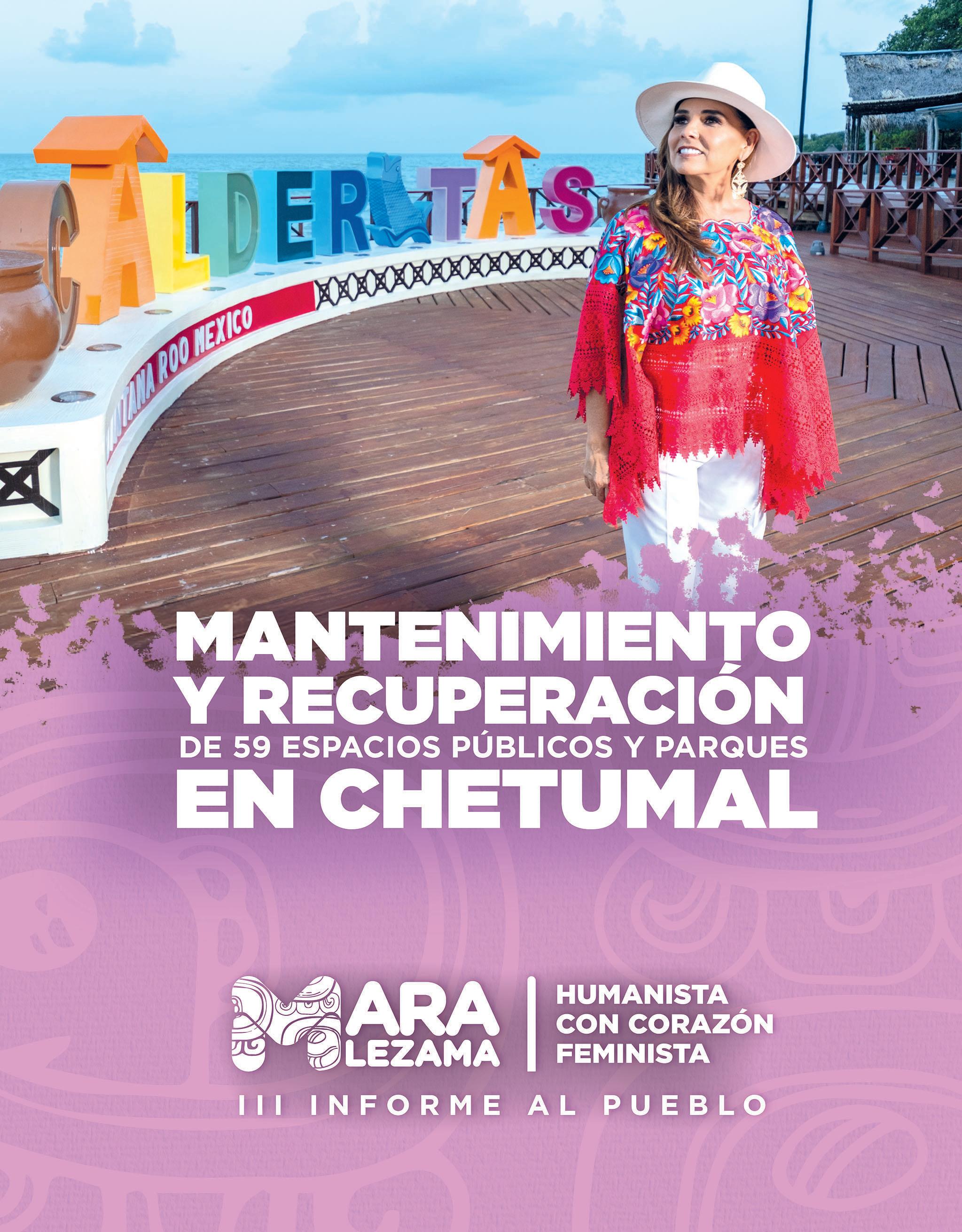 Al rendir el Tercer Informe al Pueblo de manera directa y transparente, la gobernadora Mara Lezama Espinosa destacó que al transcurrir ya más de la mitad de un gobierno honesto, diferente, se consolida un proyecto que cambia las cosas de fondo, de una vez y para siempre, bajo el modelo de la Cuarta Transformación. En la zona turística de Calderitas, comunidad de Chetumal, la capital del estado, y ante la representante de la presidenta Claudia Sheinbaum, la secretaria de Turis-