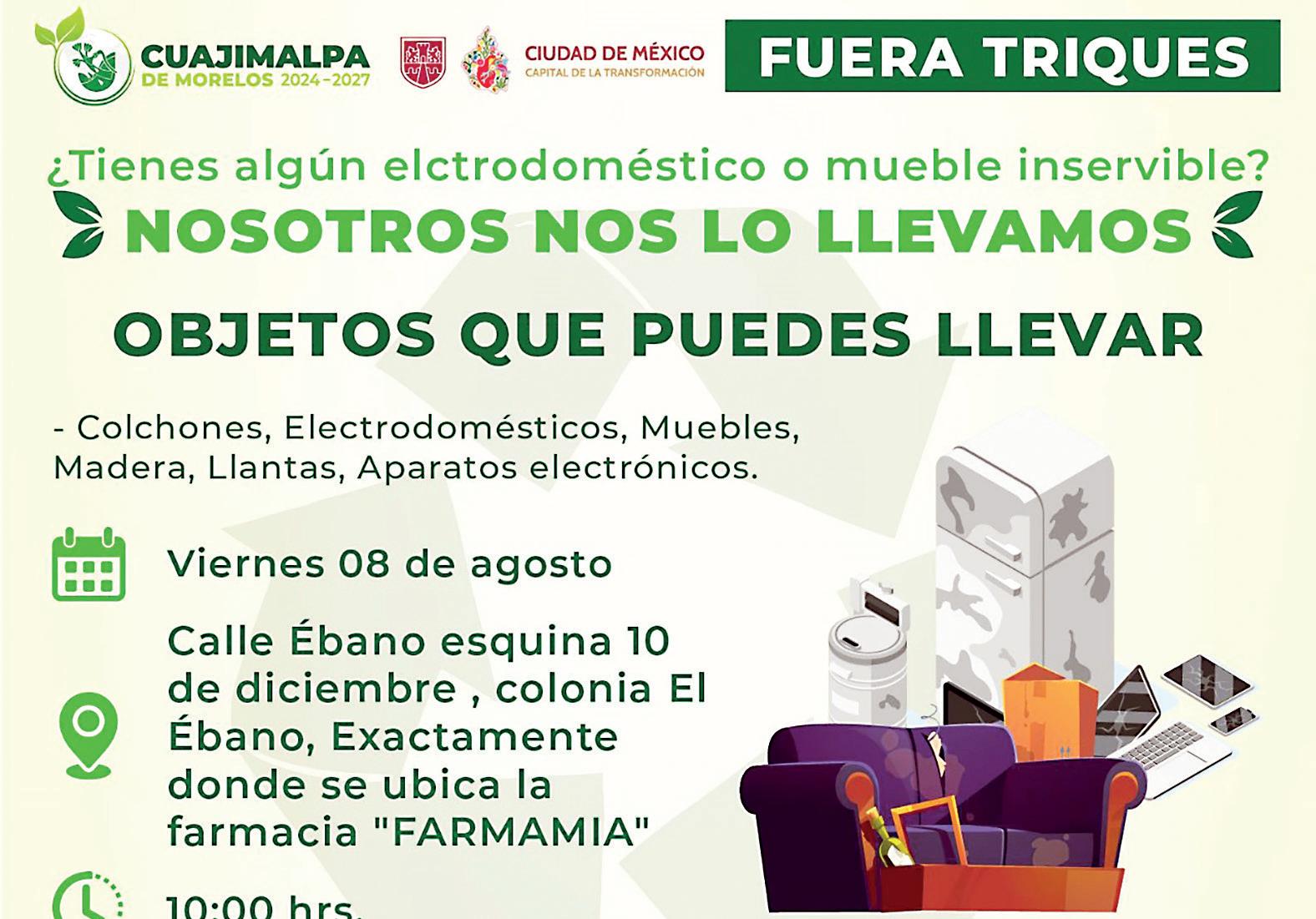 Gobierno. ¿Tienes algún electrodoméstico, colchón, madera, llantas o muebles inservibles? Nosotros vamos por ellos con el programa “Fuera Triques”, estaremos visitando la colonia El Ébano este viernes.