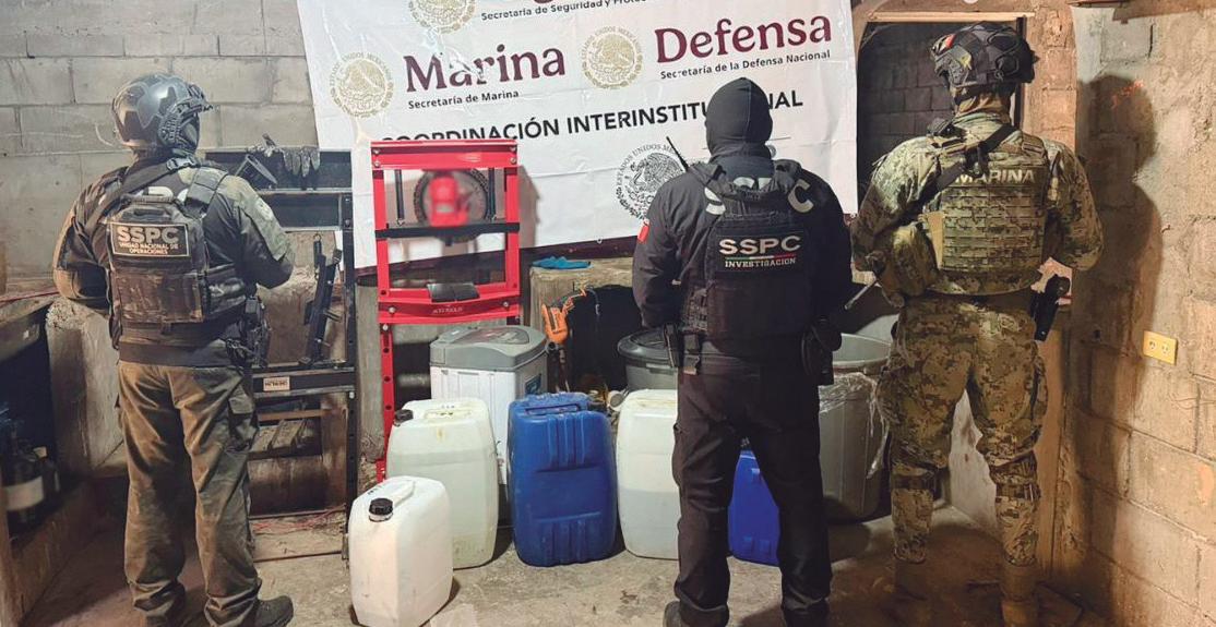Posteriormente, en otro domicilio de San Ángel, se encontraron hierba verde y seca, pastillas de colores, polvo blanco con características de cocaína, dos armas de fuego, cargadores metálicos, cartuchos útiles, radios, estampas adhesivas y ropa táctica, lo que refuerza la magnitud del operativo.