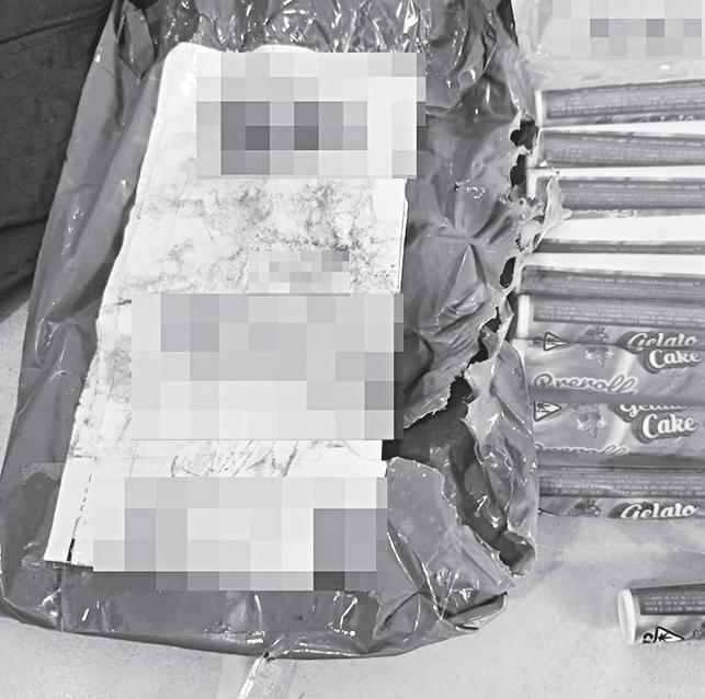 bolsa de plástico color azul que contenía en su interior diez recipientes cilíndricos, de color blanco con rosa, rotulados con la leyenda “Gelato Cake”. El diseño y etiquetado de los recipientes sugerían un intento de camuflaje, posiblemente para facilitar el transporte de los contenidos sin levantar sospechas. El hallazgo