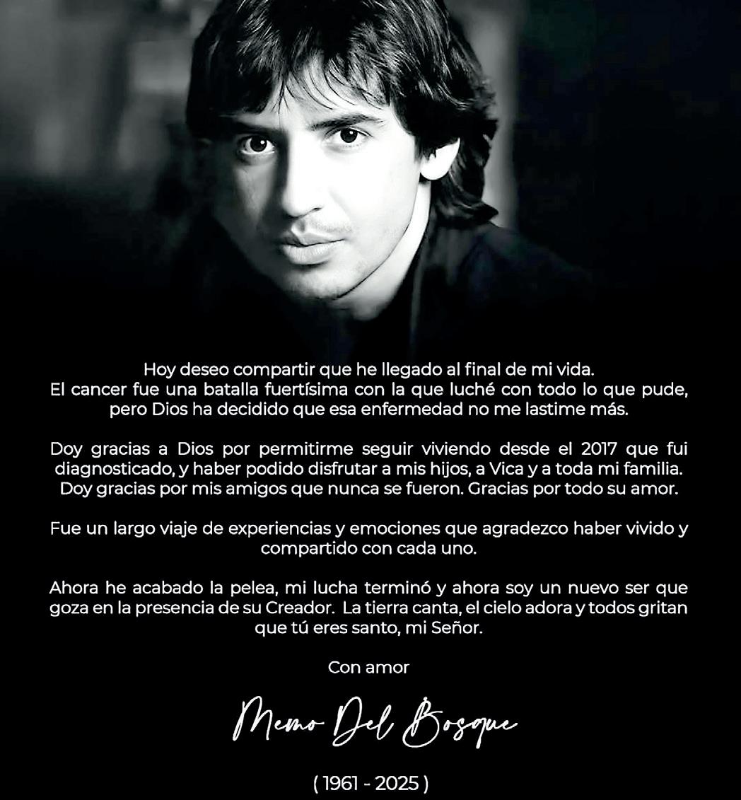 Fue en el 2020 cuando Memo del Bosque confirmó que había vencido al cáncer, luego de que en 2017 le fue diagnosticado linfoma de Hodgkin, por el que a finales de 2019 enfrentó un trasplante de médula ósea que a la postre lo llevó a recuperarse por completo. A partir de ese momento, se mantuvo en constantes chequeos para poder tener certeza de su estado de salud.