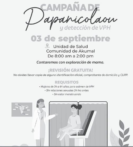 Acude hoy a la campaña de Papanicolaou y detección de VPH en la Unidad de Salud de Akumal, de 8:00 am a 2:00 pm. ¡Servicios gratuitos! No olvides tu identificación oficial, comprobante de domicilio y CURP.