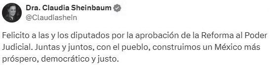En su mensaje difundido en la red social X, Sheinbaum dijo que, con la reforma, México será un país más justo, democrático y próspero. Felicito a las y los diputados por la aprobación de la Reforma al Poder Judicial. Juntas y juntos, con el pueblo, construimos un México más próspero, democrático y justo”, publicó la presidenta electa en X.