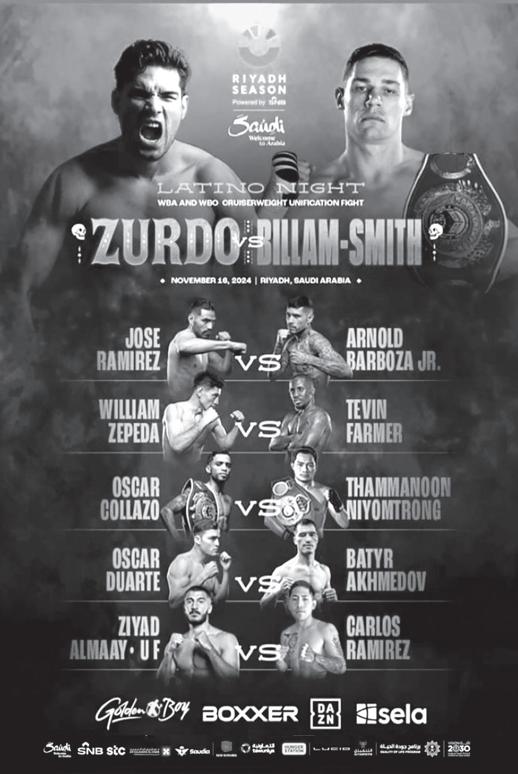 El sábado 16 de noviembre, la capital saudita, Riad, será la sede de la “Noche Latina”, que reúne a los prin cipales nombres del mundo del boxeo como parte de la “Tem porada de Riyadh 2024”.