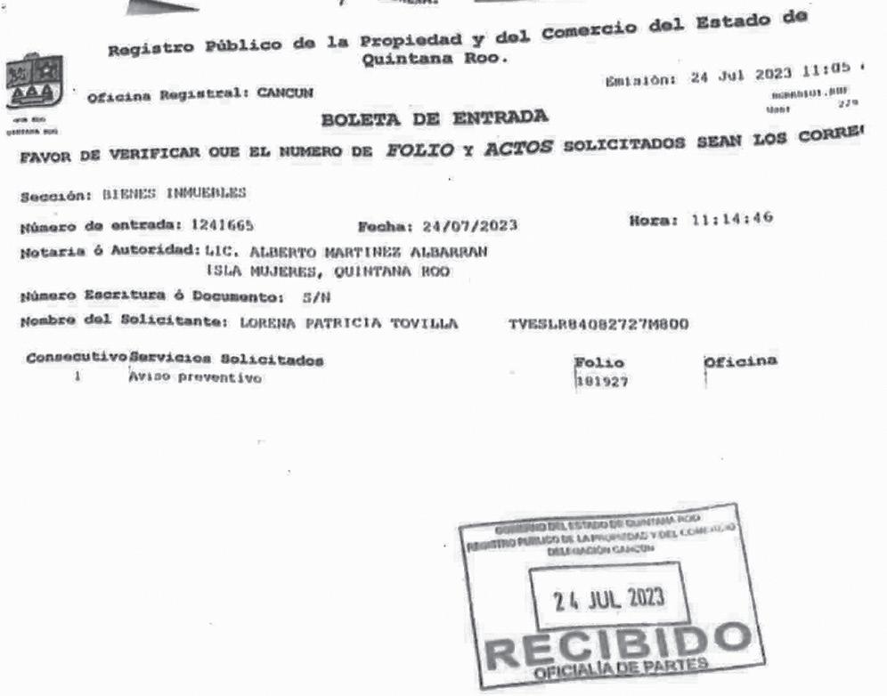 El documento con folio 181927, fechado el 21 de julio de 2023 y dirigido a la Delegación del Registro Público de la Propiedad y del Comercio del Estado de Quintana Roo, cuya titular es María Jesús Tzuc Peña, fue recibido (según el sello) el 24 de julio de 2023. En este se solicitaba la anotación del Segundo Aviso Preventivo.