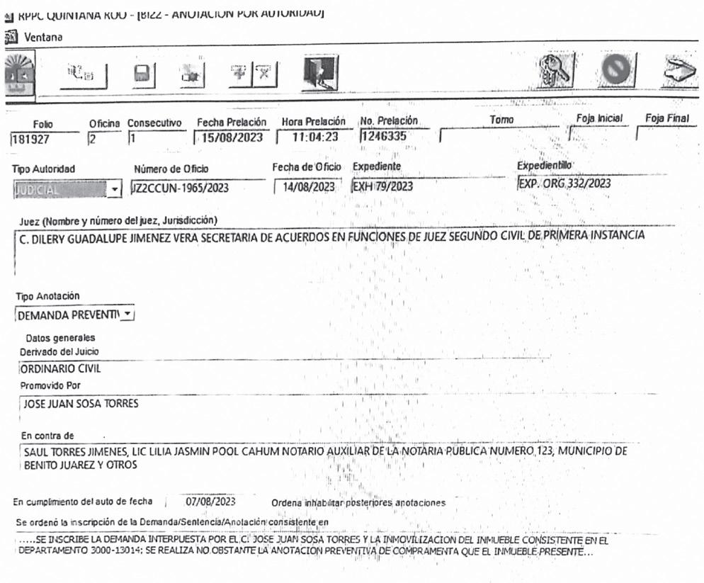 Sin embargo, de manera irregular, este documento no fue inscrito en el RPPC. La contraparte, identificada como José Juan Sosa Torres, promovió un juicio ordinario civil contra Saúl Torres Jiménez y otros, con el número de expediente JZ2CCUN-1965/2023, fechado el 14 de agosto de 2023.