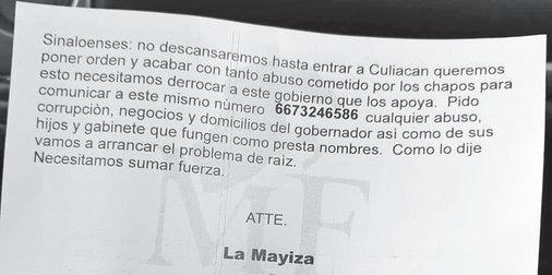 lanzados desde una avioneta sobre varios municipios del estado, incluidos Guasave, Mazatlán, Navolato, Los Mochis y Culiacán. El contenido de los volantes acusa directamente a Los Chapitos de abusos contra la población y de contar con el respaldo del gobierno estatal. El mensaje asegura que La Mayiza no descansará hasta tomar control de Culiacán y “poner orden”. En el documento, la facción de Zambada Sicairos pide a la población “sumar fuerza” para derrocar al actual gobierno, con el fin de acabar con lo que consideran un régimen corrupto que apoya a Los Chapitos. Además, el panfleto incluye un número telefónico con lada de Culiacán para que la población pueda denunciar cualquier acto de abuso