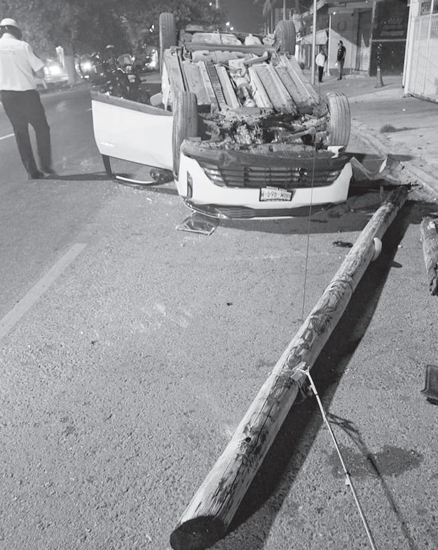 Un hombre que conducía en dirección de Oriente a Poniente sobre avenida Nichupté con calle 131 en la Supermanzana 96, un Kia tipo K3 de color blanco, no tomó en cuenta las condiciones de la vía y al perder el control de su dirección a la derecha, chocó con un poste metálico de alumbrado público y uno de madera de Telmex, derribándolos de su base. El carro terminó volcado Y abandonado, toda vez que el propietario se dio a la fuga. El accidente ocurrió a las 06:28 horas de este jueves, cuando se informó al personal de peritos de la
