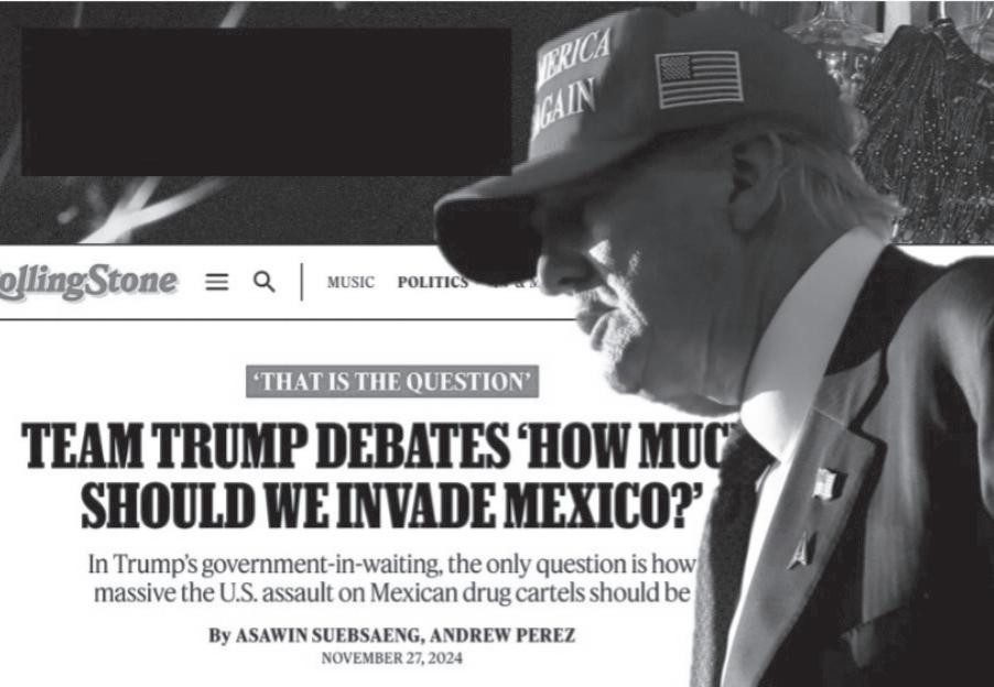 De acuerdo con un artículo publicado en la revista Rolling Stone, algunos trumpistas del segundo mandato del magnate neoyorquino han puesto en la mesa de discusión del nuevo gobierno la posibilidad de que Trump “debería cumplir su promesa de campaña de atacar o incluso invadir México, y en qué medida, como parte de la ‘guerra’ que ha prometido librar” contra los narcos.