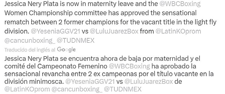 “El comité del campeonato femenino aprobó la sensacional revancha entre dos ex campeonas por el título vacante en la división Minimosca ante la baja de Jessica Nery Plata, por maternidad”, publicó en sus redes sociales Mauricio Sulaimán Saldívar, presidente del Consejo Mundial de Boxeo (CMBWBC, por sus siglas en inglés).