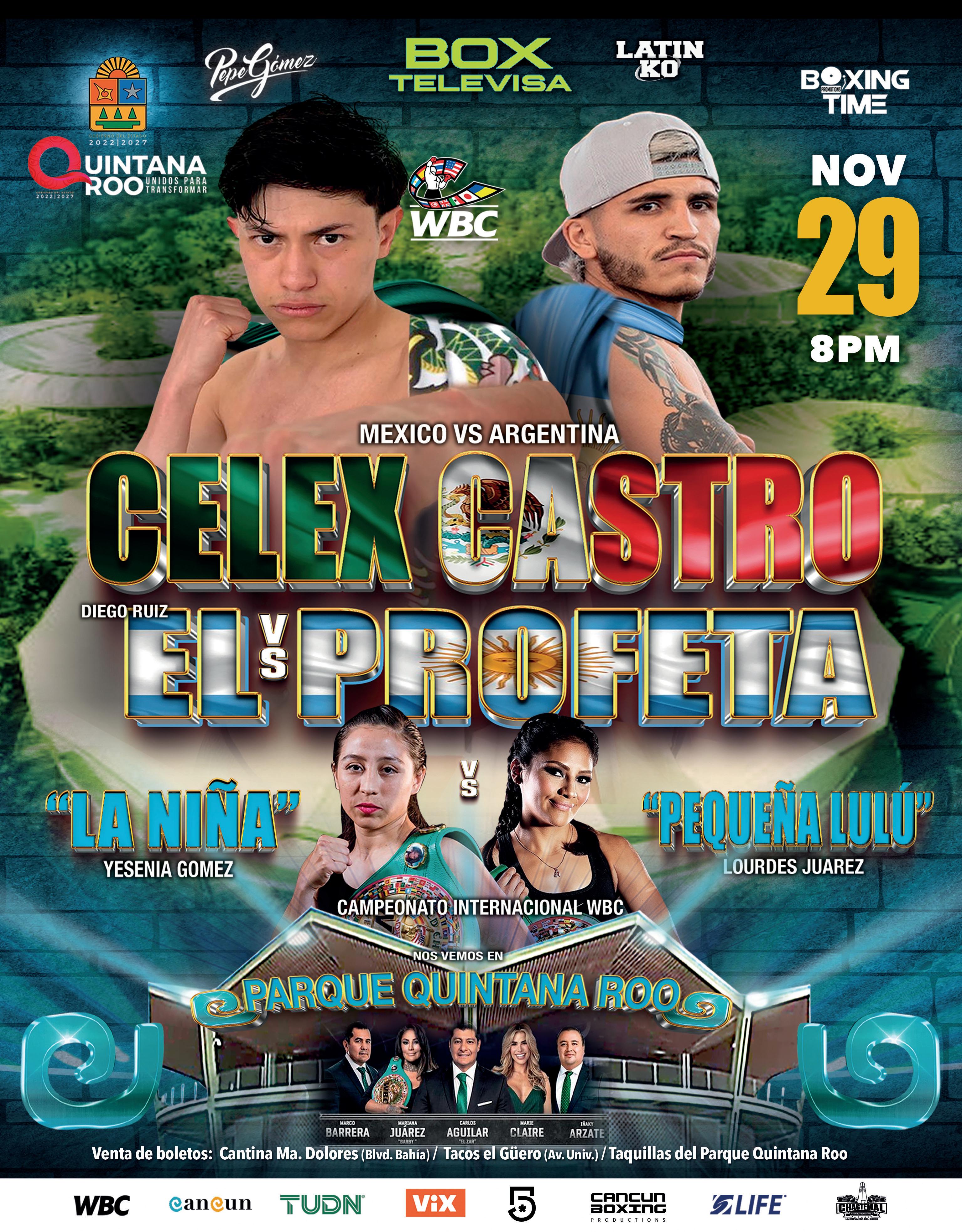 nes de hogares de América Latina y Europa a través de las señales de los “Viernes de Box Televisa” en el Canal 5, Televisa Univisión Deportes Network (TUDN) y por la plataforma de streaming internacional ViX, generando con ello una enorme promoción de imagen para la Zona Sur de Quintana Roo. El invicto cancunense Celex “CCO” Castro (18-0-0, 14 nocauts) y el argentino Diego “Profeta” Ruiz (24-10-1, 12 nocauts) no tuvieron inconvenientes para registrar el