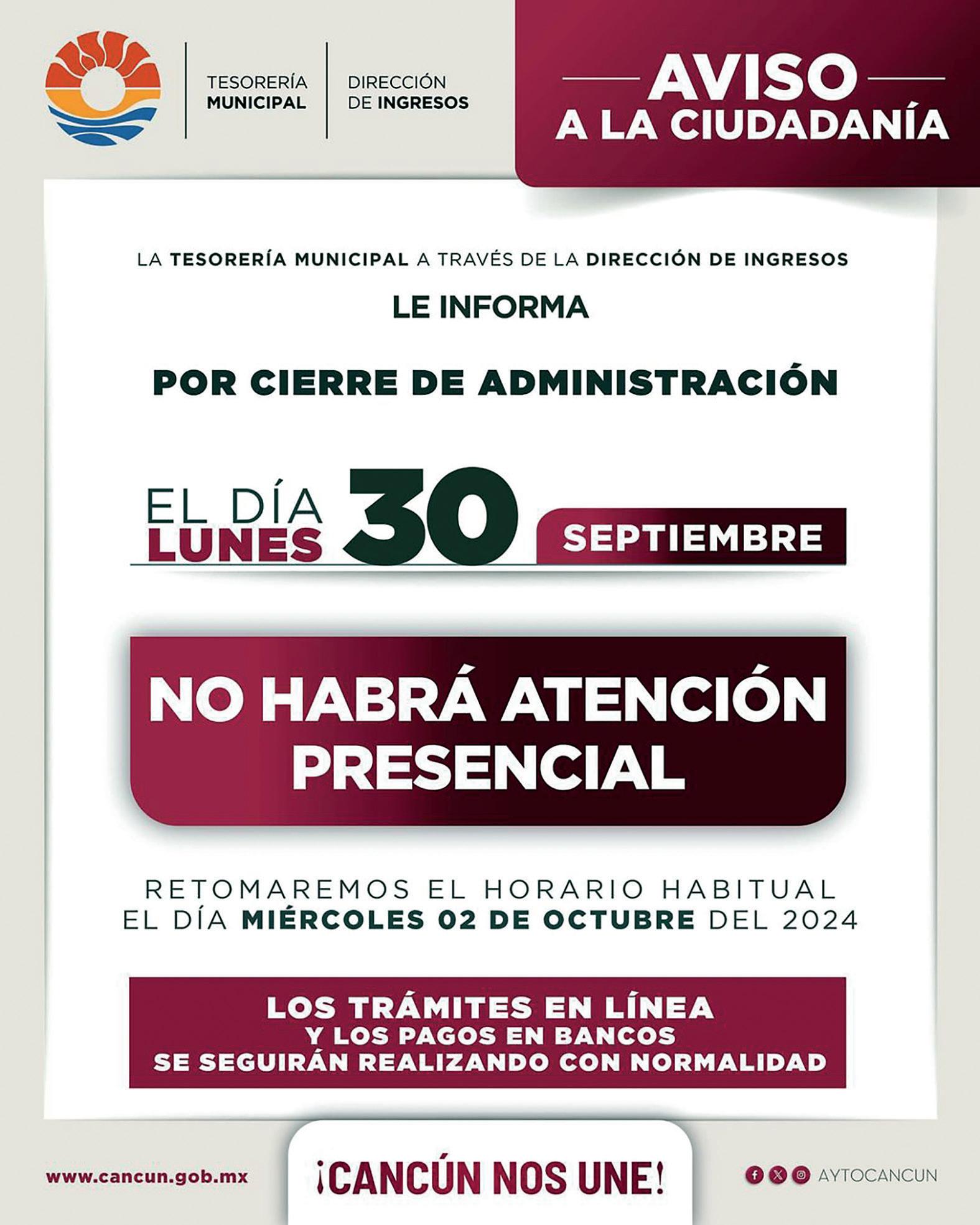 LA TESORERÍA MUNICIPAL ANUNCIÓ también que, por el cierre de administración, hoy no habrá atención presencial y retomarán actividades el miércoles 2 de octubre.