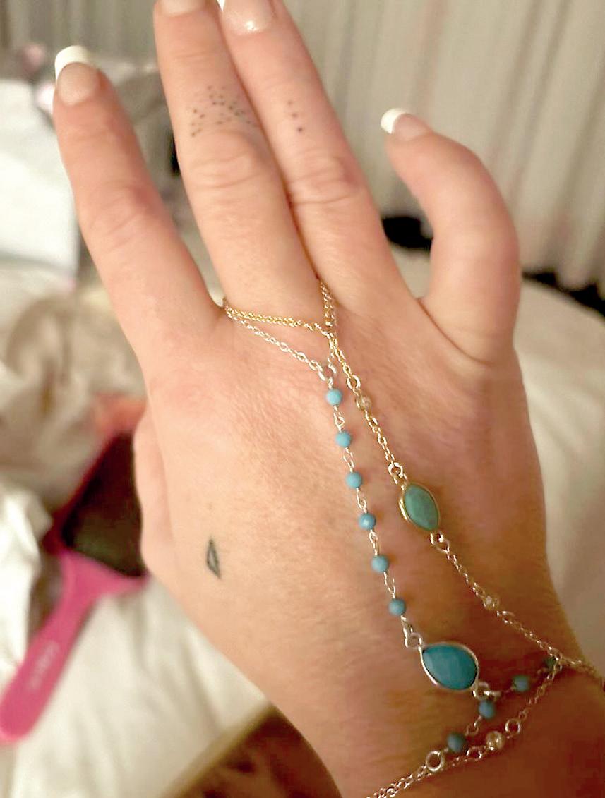 En la misma publicación, Britney Spears compartió una fotografía de sí misma modelando una muestra de su joyería, una cadena de mano con piedras preciosas azules y verdes. Asimismo, lució sus uñas con una manicura francesa y diversos tatuajes pequeños en sus manos.