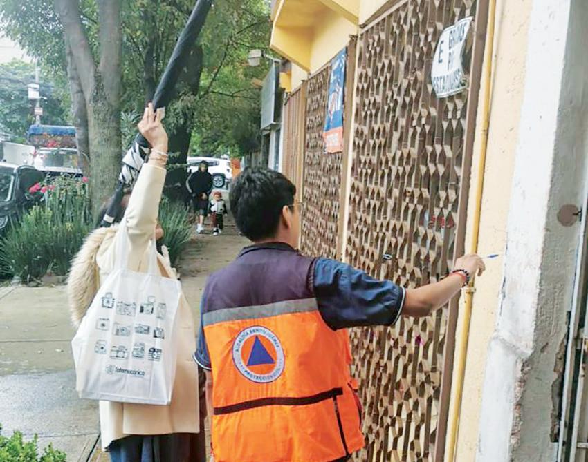 Protección civil. Personal de la Dirección de la Unidad de Gestión de Riesgos y Protección Civil de la alcaldía Benito Juárez realizó la revisión a inmuebles con motivo de los microsismos y sismo.