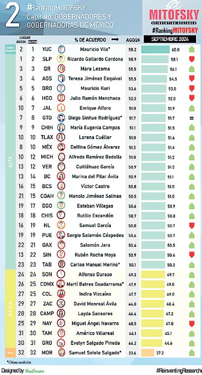 De acuerdo con el Ranking Mitofsky, siete mandatarios cayeron en número de gobernados satisfechos con su desempeño respecto de agosto: tres de Morena, dos del PAN, uno del PVEM y otro de MC; mientras que 24 subieron: 19 morenistas, dos panistas, dos priistas y un emecista; y solo uno se mantuvo igual, del PAN. De igual manera, el reporte indica que los nueve gobernadores opositores a Morena superaron por 3.5% en aprobación ciudadana (52.8%) a los 23 afines a dicho partido político (49.3%).
