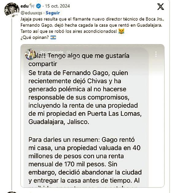 En su publicación detalló que “Gago rentó una propiedad valuada en 40 millones de pesos con una renta mensual de 170 mil pesos, sin embargo, decidió abandonar la ciudad y entregar la casa antes de tiempo”.
