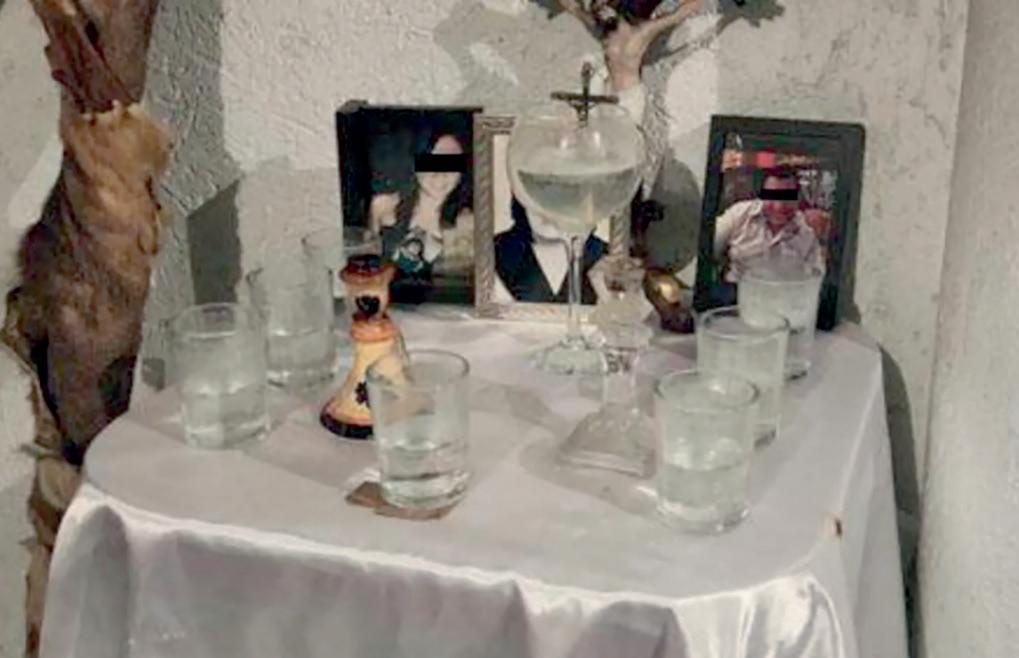 Droga, altares con imágenes para rituales de Palo Mayombe, así como imágenes religiosas y fotografías de personas y copas con agua; bidones,