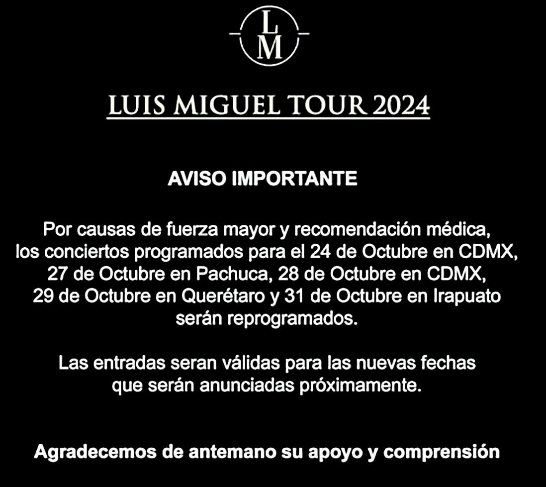 Hace unos días Luis Miguel sorprendió a sus fans al revelar que pospondría algunos de los conciertos de la etapa final de su gira por recomendaciones médicas, lo que llevó al cantante a posponer algunas fechas, sin embargo, este lunes, el periodista Gustavo Adolfo Infante reveló las verdaderas causas que llevaron al equipo de “El Sol” a tomar esta determinación.