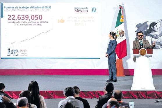 La presidenta de México, Claudia Sheinbaum, informó que al 31 de octubre de 2025 se registraron 22 millones 639 mil 50 puestos laborales, la segunda cifra más alta en la historia desde 1997. PÁG. 12