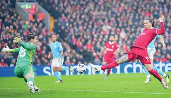 Darwin Núñez (derecha), del Liverpool, remata ante el arquero Stefan Ortega, del Manchester City. AP