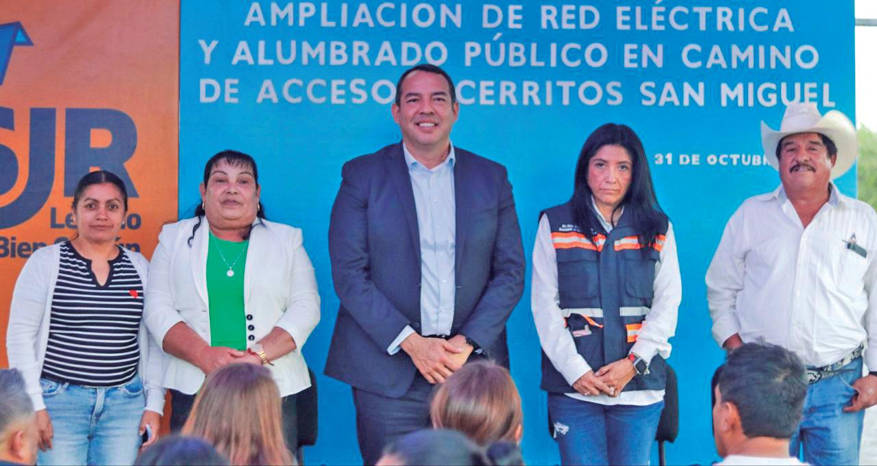 “Hoy, se cuenta con las mejores bases y más experiencia en favor de San Juan. Esta entrega de obra es muestra de que estamos construyendo un gran legado en favor de nuestra tierra”, recalcó el presidente municipal Roberto Cabrera Valencia tras la entrega de la ampliación de la red eléctrica y alumbrado público en la comunidad de Cerritos San Miguel, obra en la que se invirtió un monto de un millón 74 mil 550 pesos. El acceso a la comunidad de casi un kilómetro no contaba con ningún tipo iluminación, por lo cual los habitantes tendrán por primera vez alumbrado público en la zona. Dicha obra consiste en 945 metros lineales de red eléctrica, 23 luminarias y 23 postes de concreto, lo cual mejorará la calidad de vida de 200 habitantes de Cerritos San Miguel.