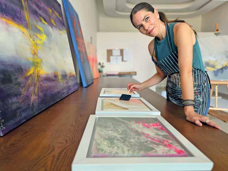 En su estudio, aún, se encuentran algunas obras de su última colección 'Reflejos', una serie que plasma la perspectiva de los hallazgos que recaba en cada momento de su día. “Puedes estar en el centro de la ciudad, viendo la catedral a las 10 de la ma-