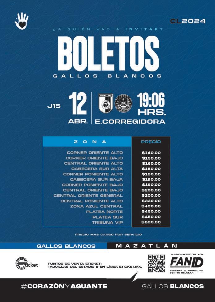 No se devuelven originales. AD QUERÉTARO, periódico diario, 12 de abril de 2024. Editor responsable: Fernando Sánchez López. Reserva de Derechos al Uso Exclusivo número 04-2022-080513290700-101 y Certificado de Licitud de Título y Contenido número 17516, de los cuales es titular AD COMUNICACIONES, S. DE R.L. DE C.V. Domicilio de la Publicación: Avenida Constituyentes Nº109, Interior 11, Colonia Carretas. C.P. 76050, Santiago de Querétaro, Querétaro. Imprenta: CIA. PERIODISTICA DEL SOL DE IRAPUATO. Domicilio: Av. Reforma #432, Gamez, C.P. 36650, Irapuato, Gto. Distribuidor: AD COMUNICACIONES, S. DE R.L. DE C.V. Avenida Constituyentes Nº 109, Interior 11, Colonia Carretas. C.P. 76050, Santiago de Querétaro, Querétaro. Servicios informativos: Cuartoscuro, AP, Mexsport, Istockphoto. Prohibida la reproducción total o parcial del contenido de esta edición. ORGULLOSAMENTE PRIMER MEDIO DE COMUNICACIÓN CERTIFICADO EN QUERÉTARO Y BAJÍO Directorio Certifi cado de Circulación, Cobertura y Perfi l del Lector folio 01058-RHY emitido por y registrado en el Padrón Nacional de Medios Impresos de la Segob.