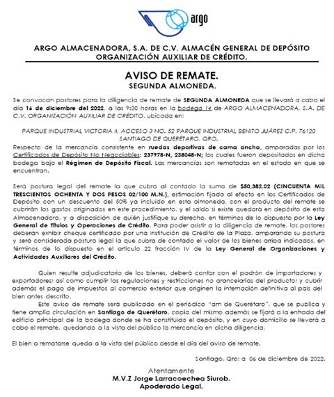 No se devuelven originales. Dirección Av. Constituyentes 109 int. 11, Colonia Carretas, CP. 76050, Santiago de Querétaro, Qro. Representantes de publicidad en México D.F: Periódico Reforma, Av. México Coyoacán No. 40, Col. Santa Cruz Atoyac, Tel. 56-28-74-41 y 5 -28-78-78 Representante en Monterrey: Periódico El Norte, Washington 629, 4o. Ote, Monterrey N.L, Tel. 83-18-84-15 Representante en Guadalajara: Periódico Mural, Mariano Otero 4047, Col. La Calma, Zapopan , Jalisco. Tel. (3) 134-35-00. AM DE QUERÉTARO es una publicación diaria. Martes 6 de diciembre de 2022. Número de Certificado de Reserva de Derechos al Uso Exclusivo otorgado por el Instituto Nacional de Derecho de Autor: 04 - 2019 - 010810045700-101. Número de Certificado de Licitud de Título y Contenido No. 17050 de fecha 12 de diciembre de 2017. Domicilio de la Publicación: Av. Constituyentes 109 int. 11, Colonia Carretas, CP. 76050, Santiago de Querétaro, Qro. Imprenta: Bucareli No. 8, Col. Centro, Alcaldía Cuauhtémoc, C.P. 06040, CDMX Servicios informativos: Cuartoscuro, AP, Mexsport, Istockphoto. Prohibida la reproducción total o parcial del contenido de esta edición. DIRECTOR GENERAL EDITORIAL Miguel Ángel Flores García mflores@adcomunicaciones.mx CONTENIDOS editores@amqueretaro.com Miguel Tierrafría Magdiel Torres Georgina Fernández Juan Carlos Machorro Mauricio del Ángel Berenice Rodríguez ARTE E IMAGEN Marco A. Rodríguez Juan Palma Daniela Ramírez Diseño Editorial Isai López Fotografía y Video AMQUERETARO.COM internet@amqueretaro.com Lorena Rudo Editora Web Estefany González Community Manager Hans Alfonso Frei Nieto, José de la Garza Pedraza, Juan Germán Torres Landa García, Verónica Valverde, Alejandra Vega Reyes, Luis Miguel Rubín Colea, María Genoveva Anaya Saavedra, Mariana Vidales Guerrero, Óscar Peralta Casares, Pedro Ruiz Velasco, Mauricio Sánchez Botello CONSEJO EDITORIAL DIRECTOR COMERCIAL Antonio Collado Prieto acollado@adcomunicaciones.mx Editado por la empresa AD Comunicaciones S de RL de CV Directorio publicidad@adcomunicaciones.mx Móvil: (442) 479 14 89 Oficina: (442) 291 99 00 ALIANZAS DE COLABORACIÓN SUSCRIPCIONES Andrea Jiménez suscripciones@adcomunicaciones.mx CIRCULACIÓN Emmanuel Hernández pagos@adcomunicaciones.mx ADMINISTRACIÓN Mariana Picazo administracion@adcomunicaciones.mx JEFATURA DE INFORMACIÓN Marittza Navarro JEFATURA DE REPORTEROS Salvador Castillo EDITORA GENERAL VSD! Y WEEKEND Arcelia Guadarrama Certificado de Circulación, Cobertura y Perfil del Lector folio 01058-RHY emitido por y registrado en el Padrón Nacional de Medios Impresos de la Segob.
